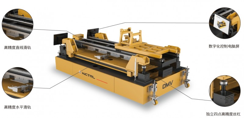 OMV飛機引擎安裝設(shè)備利用麥克納姆輪實現(xiàn)零回轉(zhuǎn)半徑、側(cè)移、全方位無死角任意漂移,具有獨立四點舉升裝置,結(jié)合自助導(dǎo)航、激光二次定位、導(dǎo)軌精密調(diào)節(jié)、控制發(fā)動機的移動、視覺精密定位完成六自由度精密裝配。