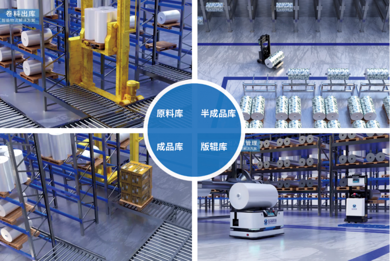 針對以上痛點,藍芯科技以智能拆包裝置、打橫裝置、上下料機器人、無人叉車、搬運機器人、分切下料打包自動線為主體,結(jié)合智能倉儲設(shè)備、信息化管理系統(tǒng),實現(xiàn)包裝企業(yè)來料自動拆包、物料自主搬運、卷料自動上/下料、庫位自動識別、成品/半成品/原料自動出入庫作業(yè)。