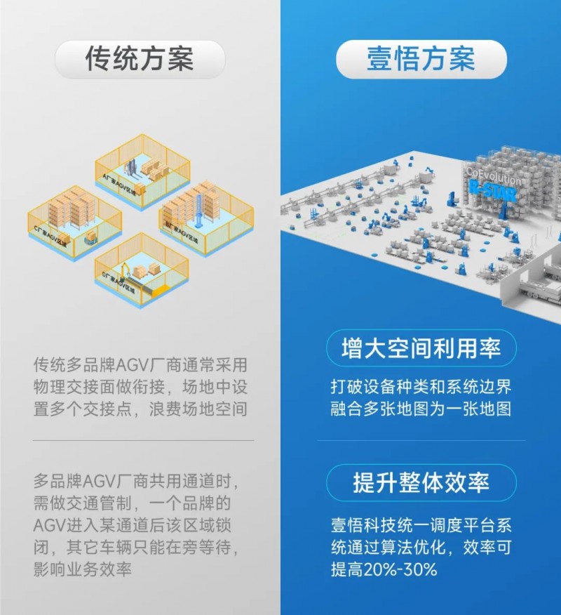 壹悟科技星羅自動化工廠解決方案,可打破設備種類與品牌的邊界,將原本封閉運行的硬件區(qū)域融合互通,把分裂的“多張地圖”合并為一張地圖,實現(xiàn)多種設備的信息互通,真正實現(xiàn)效率與空間利用率的雙向提升。