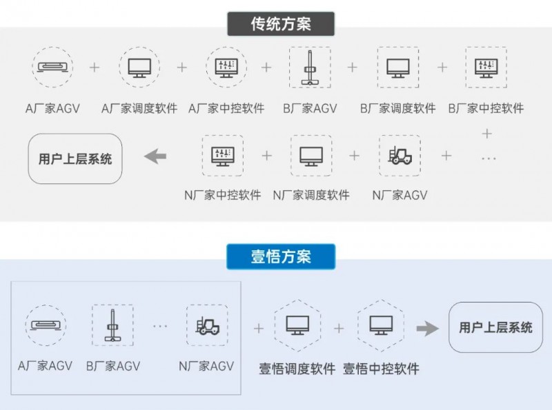 同等作業(yè)效率下,壹悟科技星羅自動化工廠解決方案,不僅可以輕松實現(xiàn)“一套系統(tǒng)調度全場”,大幅降低改造成本與對接工作量,還可以通過軟件靈活配置和修改流程,快速適應業(yè)務變化。
