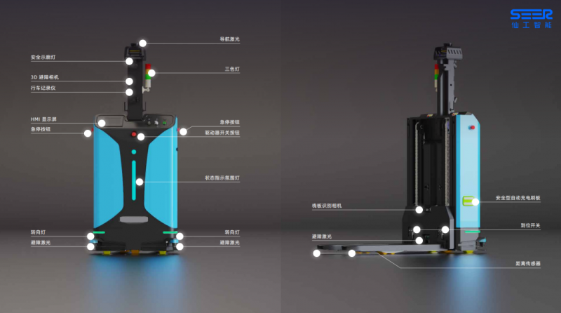 仙工智能 SRC 系列核心控制器打造的激光 SLAM 智能叉車整車實現(xiàn)多種傳感器的超高配置,360° 立體安全防護,提升了 AMR 運行過程中的安全等級,包括:導航激光、前后避障激光、安全觸邊、距離傳感器、急停按鈕、3D 避障相機等。