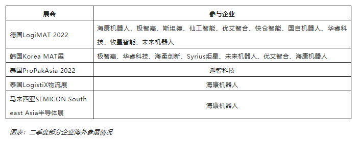 二季度,海外比較受關注的展會如德國LogiMAT 2022及韓國Korea MAT展都吸引了不少國內企業的參與,如??禉C器人、極智嘉、斯坦德、仙工智能、優艾智合、快倉智能、國自機器人、華??萍?、牧星智能等,都攜旗下代表性產品及方案一一亮相。