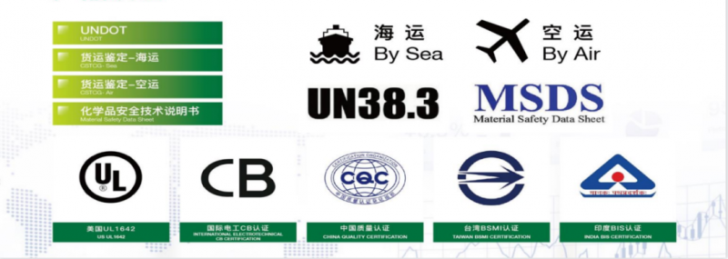 電池因其本身材質構造原因,在使用當中對穩定性、安全性有著極高要求。基于此,領域科技深入技術研發,把控每一個產品細節,使其達到國際水準,公司已通過ISO9001、ISO14001、ISO45001、ITAF16949體系認證,產品均符合國際運輸UN38.3認證、歐盟CE認證、北美UL認證及德國萊茵TUV認證要求,具備國際競爭力。