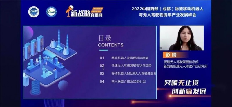 11月23日,由中國(guó)移動(dòng)機(jī)器人(AGV/AMR)產(chǎn)業(yè)聯(lián)盟、低速無人駕駛產(chǎn)業(yè)聯(lián)盟、《物流搬運(yùn)機(jī)器人》雜志社、《低速無人車》雜志社、成都北辰中金展覽有限公司聯(lián)合主辦,新戰(zhàn)略移動(dòng)機(jī)器人全媒體、 新戰(zhàn)略低速無人駕駛?cè)襟w協(xié)辦的2022中國(guó)西部(成都)物流移動(dòng)機(jī)器人與無人駕駛物流車發(fā)展峰會(huì)在線上成功舉行!