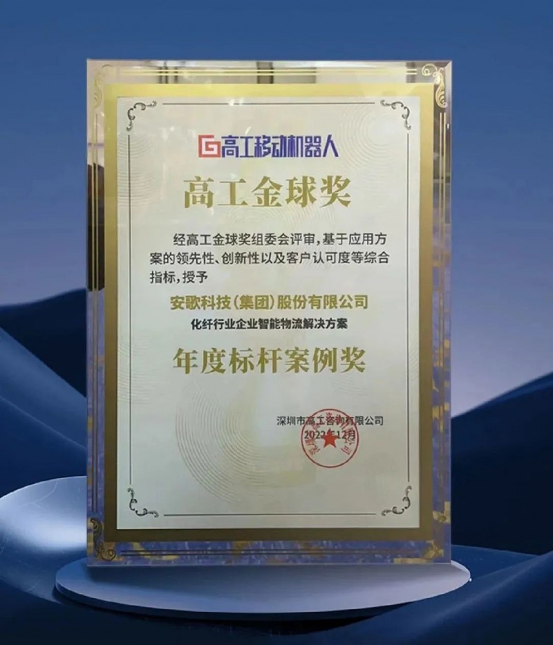 2022年12月安歌科技的化纖解決方案憑借優(yōu)秀的團(tuán)隊(duì)配合度、創(chuàng)新的技術(shù)、杰出的集成能力,以及自研自產(chǎn)的硬件+軟件+系統(tǒng)+服務(wù)的創(chuàng)新集成模式,榮膺2022化纖行業(yè)企業(yè)智能物流解決方案 年度標(biāo)桿案例獎。