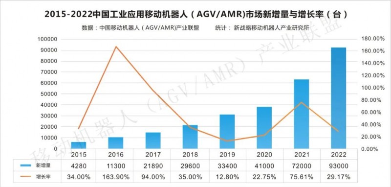 2015-2022中國工業應用移動機器人(AGV/AMR)新增量與增長率
