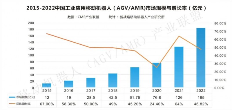 根據CMR產業聯盟數據,新戰略移動機器人產業研究所統計,2022年度,中國工業應用移動機器人(AGV/AMR)銷售數量93000臺較2021年增長29.17%,市場規模達到185億元,同比增長46.82%。