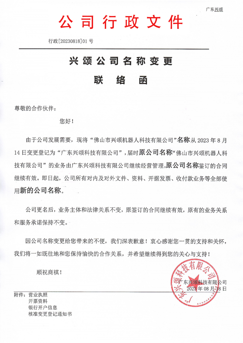 因企業發展需要,2023年8月14日我司名稱由“佛山市興頌機器人科技有限公司”變更為“廣東興頌科技有限公司”