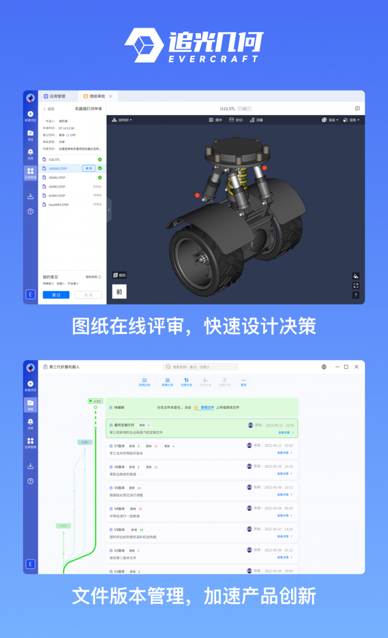 這里面有追光幾何的幫助,同時(shí)新品開發(fā)流程優(yōu)化和打通也提升了很多效率,比如我們還用了低代碼平臺(tái)搭建了業(yè)務(wù)流程,多維表格進(jìn)行項(xiàng)目管理,追光幾何則是應(yīng)用在產(chǎn)品版本迭代和設(shè)計(jì)圖紙?jiān)u審環(huán)節(jié)。