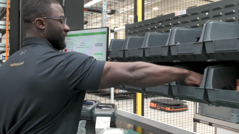 Farsound倉庫投入使用 “貨到人” 解決方案,布置了650個(gè)可移動(dòng)貨架和8個(gè)揀選站。同時(shí),設(shè)置指示燈和PTL分撥墻引導(dǎo)員工作業(yè),確保揀選、投放準(zhǔn)確。該方案釋放了32,000個(gè)料箱的額外存儲(chǔ)空間,提升了場地空間利用率。