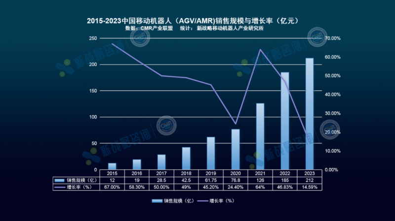 圖表:2015-2023中國工業應用移動機器人(AGV/AMR)銷售規模與增長率