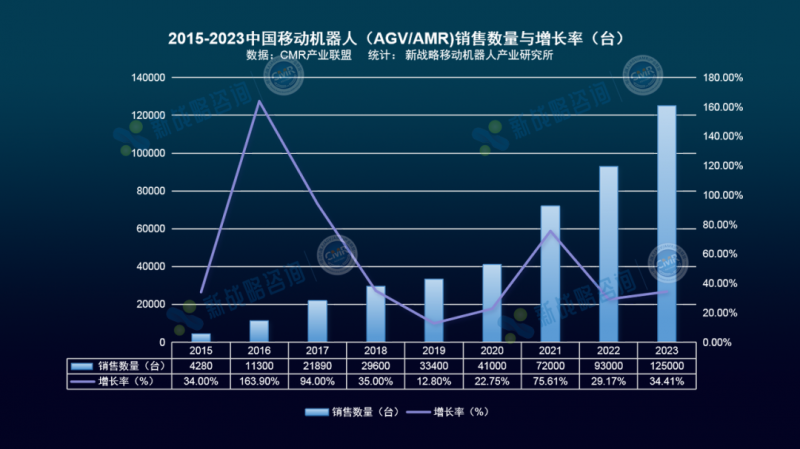圖表:2015-2023中國工業應用移動機器人(AGV/AMR)銷售數量與增長率