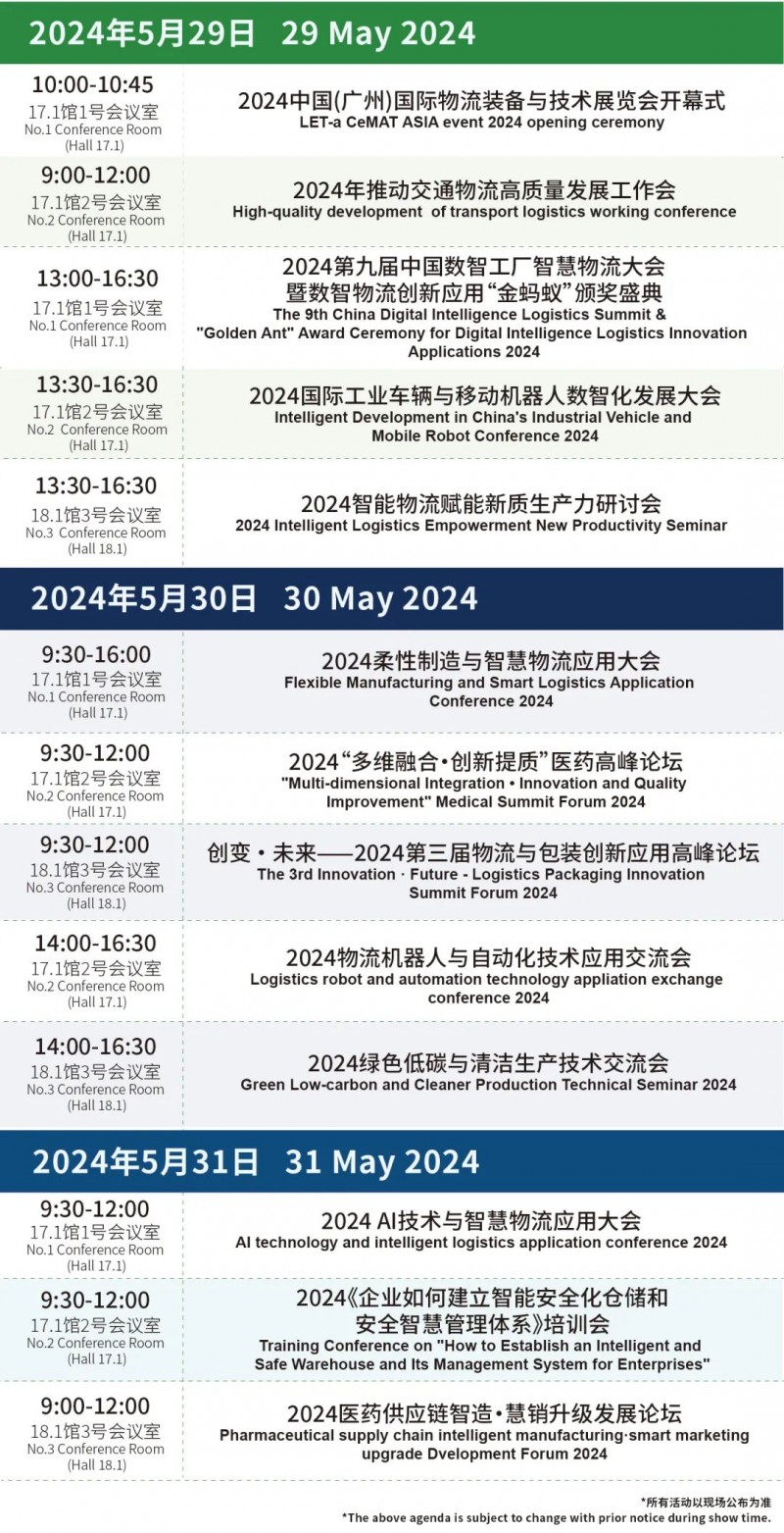 LET 2024將舉辦近20場高質(zhì)量同期活動,與物流大咖、資深人士共同探討2024破“卷”之道,重磅品牌活動——第9屆數(shù)智物流創(chuàng)新應(yīng)用"金螞蟻"頒獎(jiǎng)盛典將于展會首日重磅來襲。三天展期活動主題覆蓋新質(zhì)生產(chǎn)力、柔性制造、AI技術(shù)應(yīng)用、移動機(jī)器人、物流機(jī)器人、智能包裝、醫(yī)藥物流、綠色低碳等熱門領(lǐng)域。