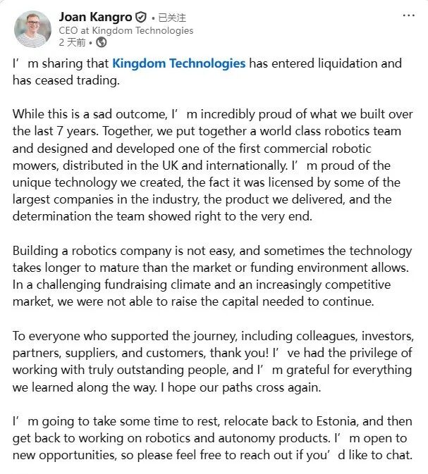 事實上,Kingdom Technologies的倒下并非個例。2025年以來,盡管割草機器人賽道仍被資本與行業(yè)視為“藍海領域”,但國內(nèi)外已有多家企業(yè)相繼關停倒閉,賽道洗牌態(tài)勢愈發(fā)明顯。國內(nèi)市場方面,2025年上半年,專注于家用智能割草機器人的森合創(chuàng)新因資金鏈斷裂宣布停止運營,其曾憑借高顏值設計和親民定價收獲不少消費者關注,但受限于研發(fā)投入不足、供應鏈管控能力薄弱,難以應對市場競爭;同年年中,杭州蘇珀曼智能科技等初創(chuàng)企業(yè)也相繼關停,均因融資不及預期、市場拓展受阻、產(chǎn)品迭代滯后等問題黯然退場。