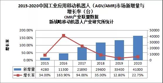 圖表:2015-2020中國工業(yè)應(yīng)用移動機器人(AGV/AMR)市場新增量(臺)與增長率