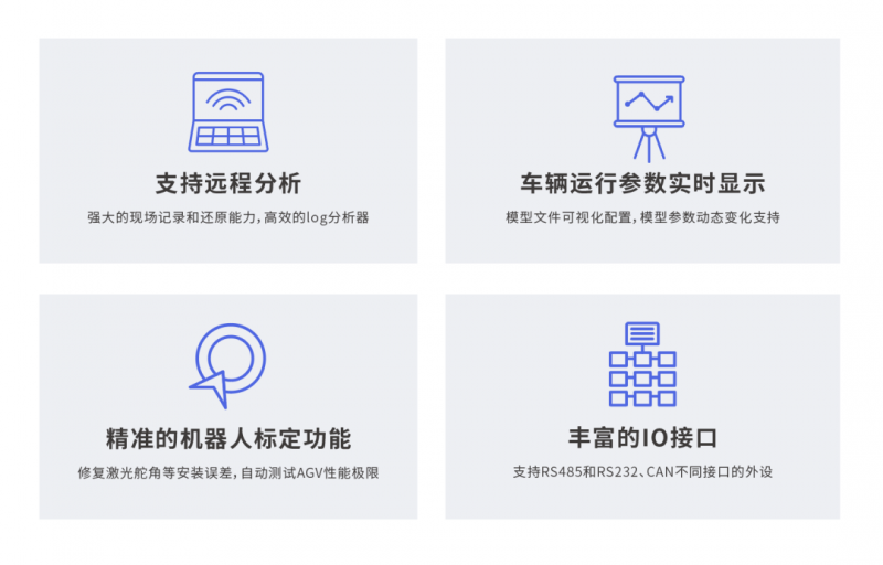 本產品將移動機器人的核心組件集成于一體,配合功能強大的客戶端軟件 Roboshop,可幫助用戶快速實現機器人搭建。