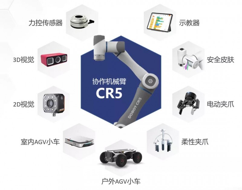 作為計劃的一部分,越疆推出了展翅、凌云1.0、凌云2.0三大套件組合,套件包括CR5協作機器人、示教器、安全皮膚、2D和3D視覺,柔性夾爪、電動夾爪、力傳感器、戶外/室內GV小車等基礎單元,適配工業、商業、醫療、農業等多種場景應用創新方案的搭建。