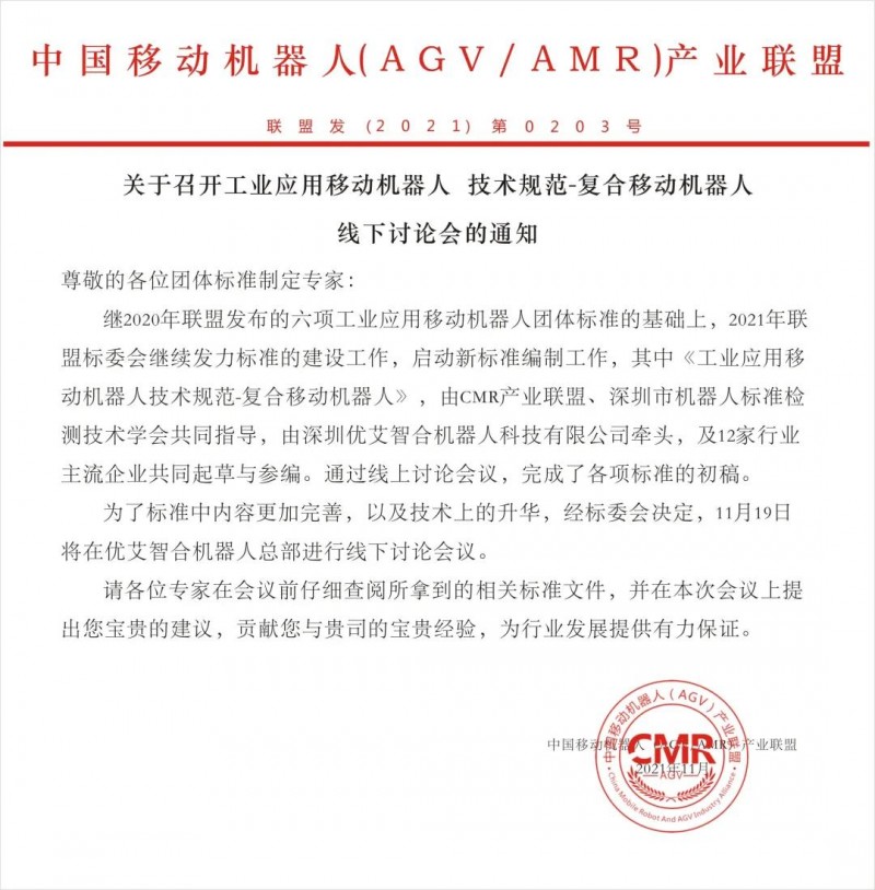 關于召開《工業應用移動機器人 技術規范-復合移動機器人》線下討論會的通知