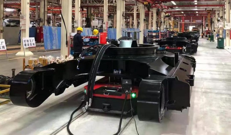 大挖工廠(chǎng)使用國(guó)自20噸重載AGV+30噸RGV,串聯(lián)起產(chǎn)線(xiàn)裝配工位,實(shí)現(xiàn)上線(xiàn)、下線(xiàn)全程智能化調(diào)度。