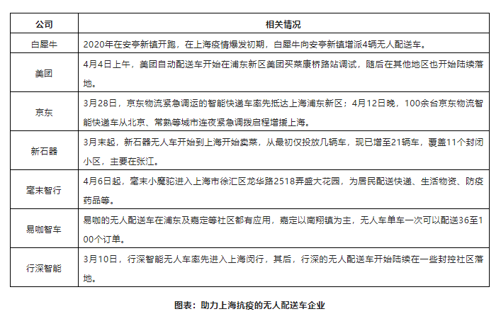 自疫情爆發后,白犀牛、新石器、易咖智車、毫末智行、行深智能等多家無人配送車企業,第一時間馳援上海開展無人配送,協助商超抗疫保供,應對訂單激增、運力緊張所帶來的挑戰。